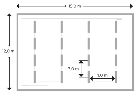 Sådan sikres det, at kravene i den europæiske standard for belysning i industribygninger overholdes (antaget loftshøjde: 4 m):