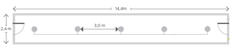 Προκειμένου οι διάδρομοι (ύψος οροφής 2,8 m) να πληρούν το Ευρωπαϊκό πρότυπο φωτισμού, εξασφαλίστε απόσταση 3 μέτρων μεταξύ των φωτιστικών.