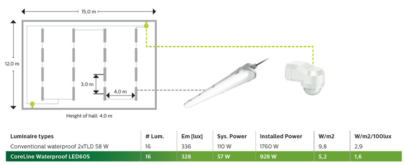 TCO-voorbeeld voor een fabriekshal met lage plafonds